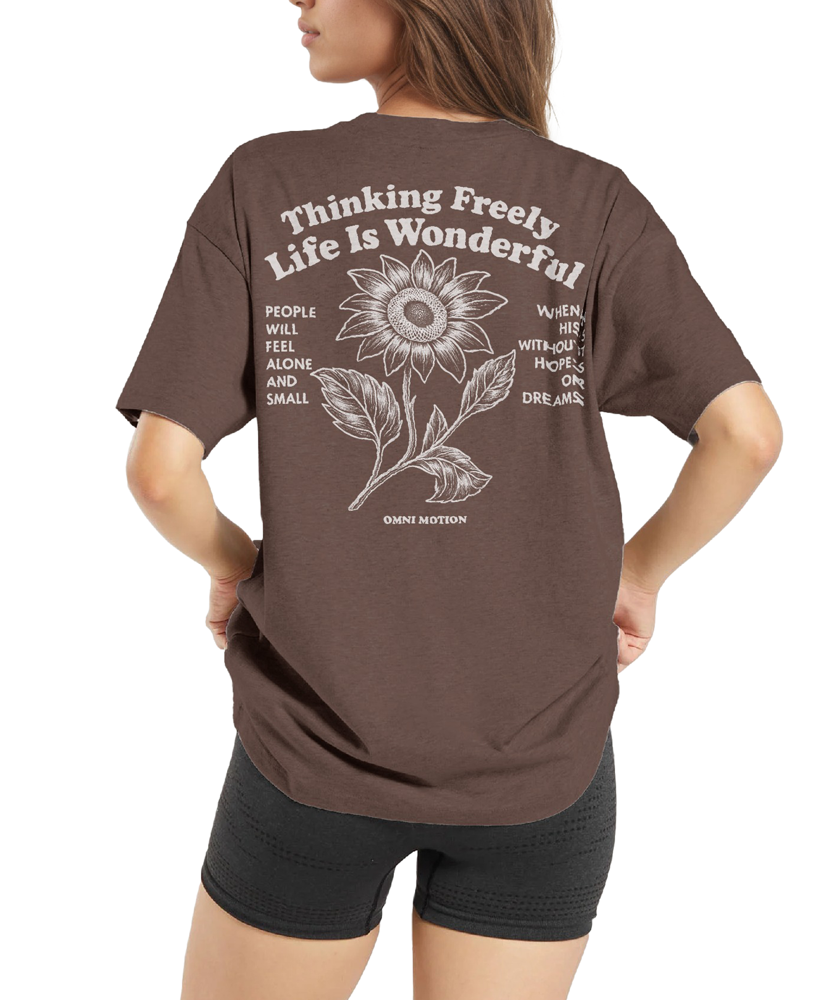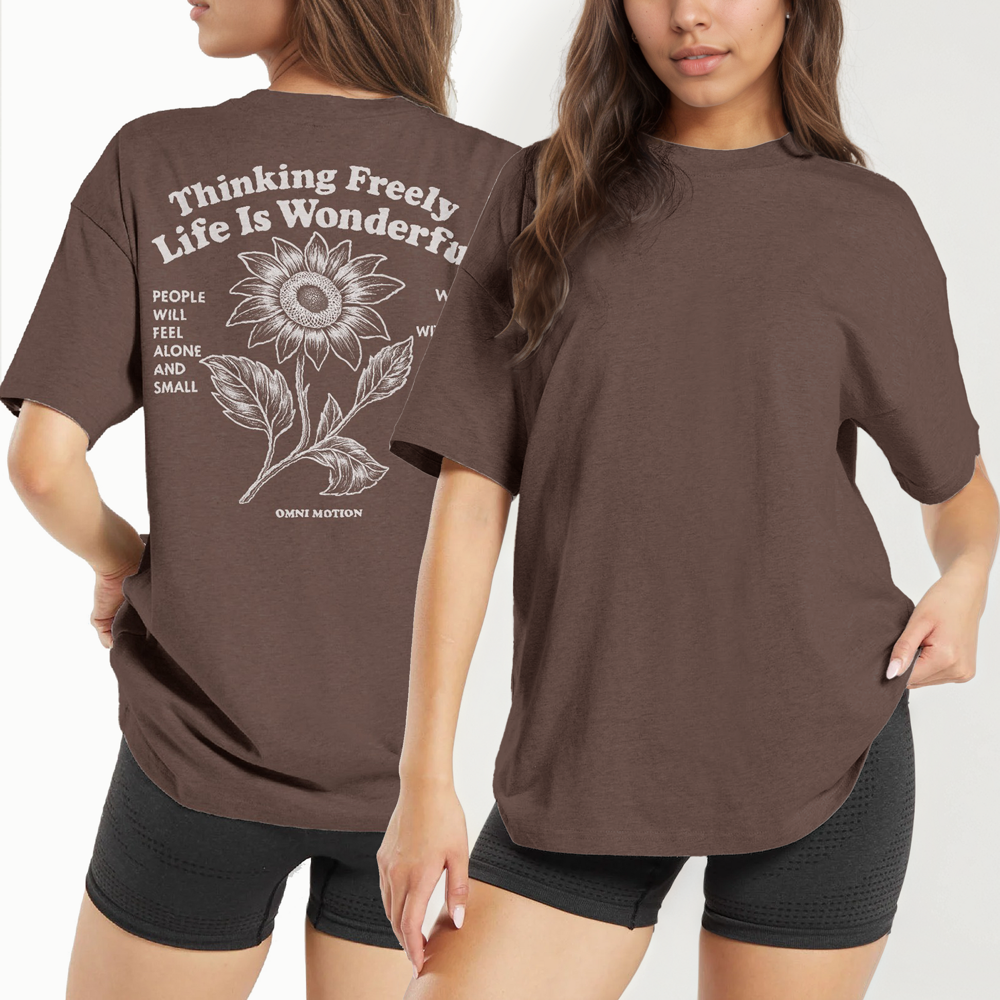 - Free Spirit Vibe: Boldly showcases "Thinking Freely Life Is Wonderful" paired with a striking sunflower graphic on the back. An empowering statement piece radiating positivity and inspiring a joyful, independent mindset.
